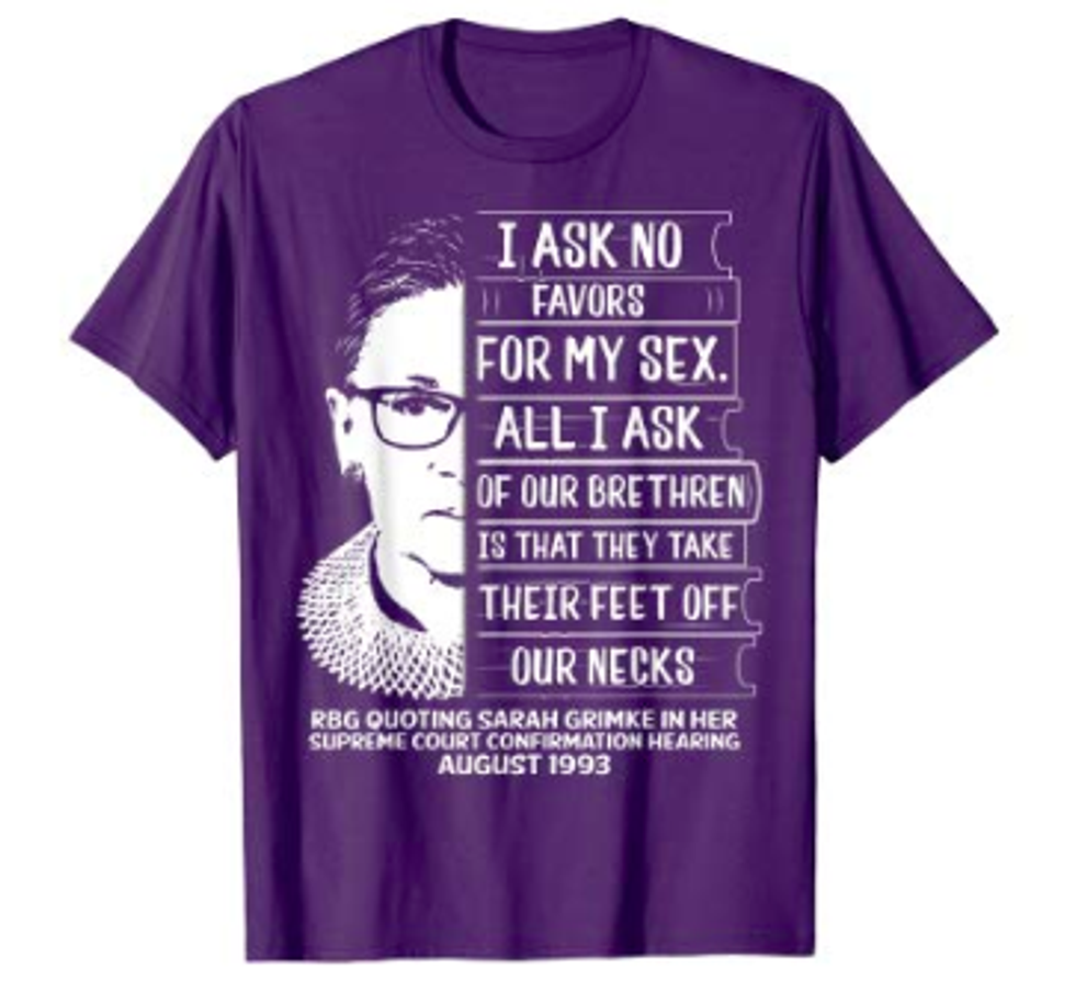 Show your solidarity for women's rights, this shirt commemorating Ruth Bader Ginsberg remarks when she joined the Supreme Court is available here.