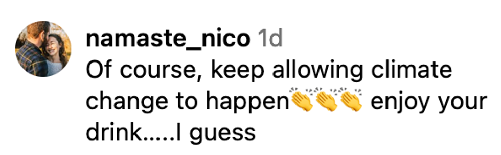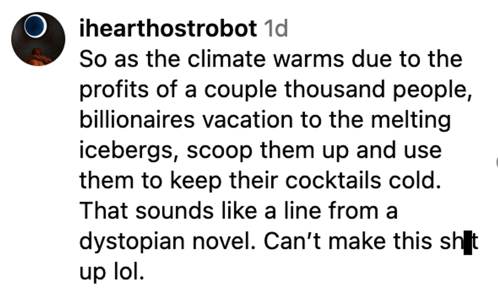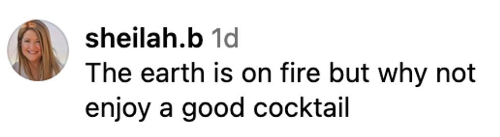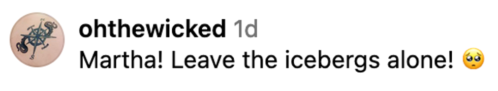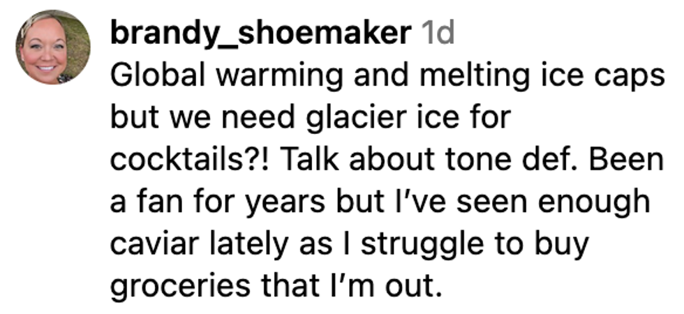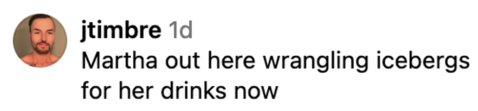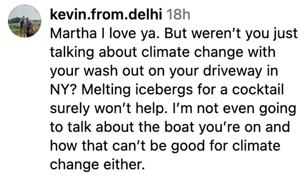 "I generally love Martha and the excesses of her life because she's about beautiful gardens, homes, and food, but wealthy white people drinking their iceberg cocktails while the planet is in flames is a bit tone deaf."