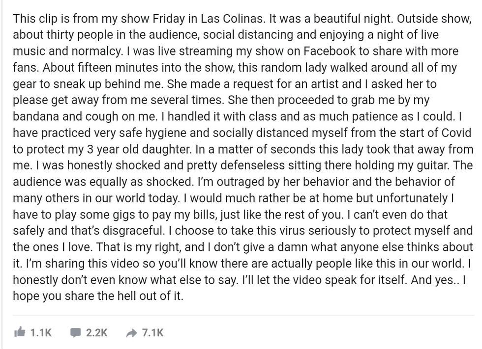 The woman approached Gardner to make a song request, but when he asked her to do so from six feet away, to adhere to social distancing recommendations, she got right up in his face, grabbed the bandana he was wearing and seemed to try to cough into his face.