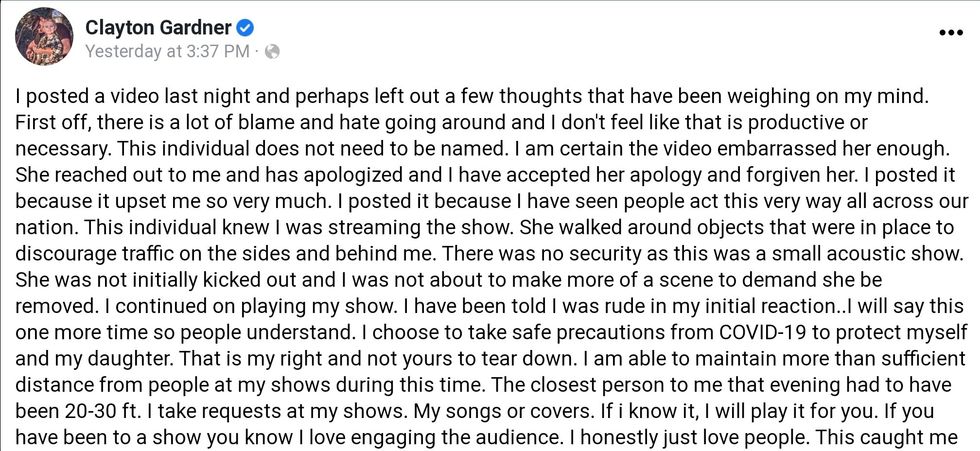In a follow-up Facebook post, Gardner said the woman has since apologized.