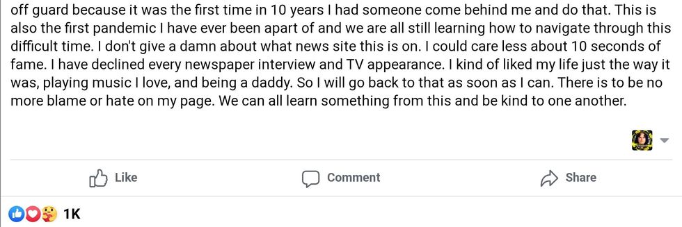 In his first Facebook post, Gardner described the incident, which he said left him "outraged"—especially because he has been diligent about precautions against the virus to protect his young daughter.