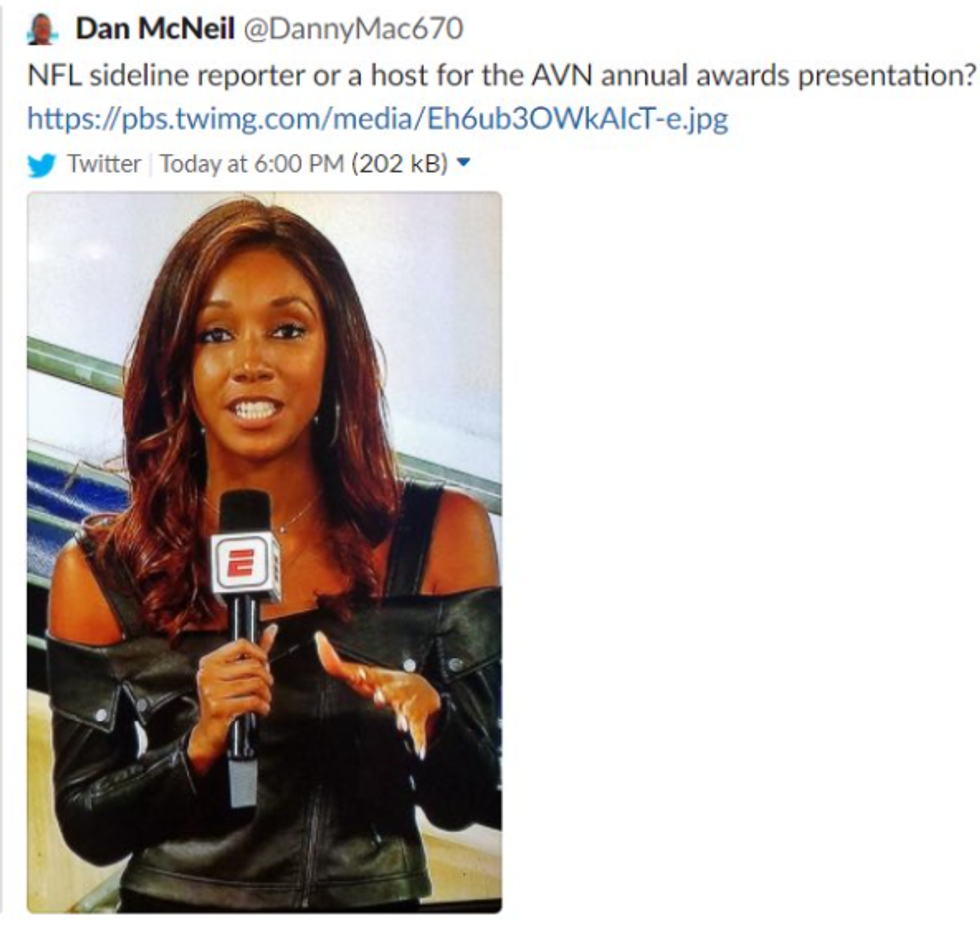 McNeil took one look at this woman making career strides he never did then posted her picture in a now-deleted tweet that questioned whether she was an NFL sideline reporter or a host at the AVN awards.
