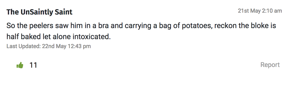 Police arrested 30-year-old James Johnson at Travelodge in Eastleigh. James wore a bra over his shirt, appeared intoxicated and was apparently filling a bathtub with potatoes in the hotel room.
