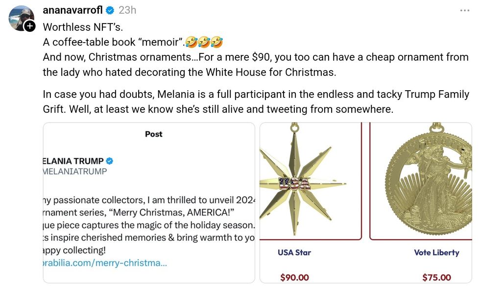 In what has become an annual cash grab—or beloved holiday tradition for MAGA minions, former First Lady Melania Trump unveiled her latest Christmas ornament collection on social media on Saturday.