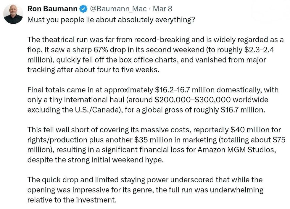 The Amazon MGM production set a record as the most expensive documentary ever made at $40 million for production/acquisition and $35 million for promotion. It's a dubious record at best as the film has only grossed approximately $16.6 to $16.7 million worldwide during its theatrical run.