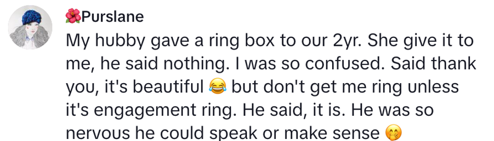 "Since then, he's been very sweet and he's been proposing to me over and over."