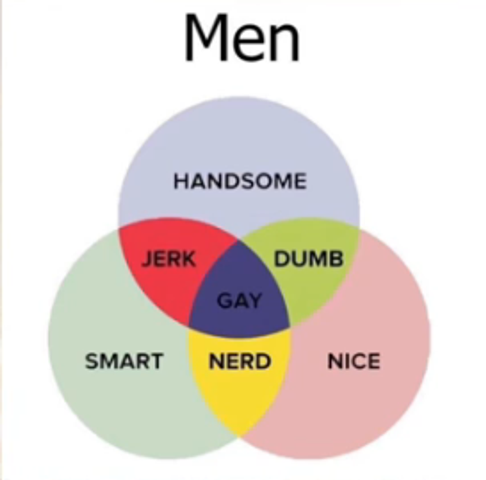 This Menn Diagram is meant to be read like a traditional Venn Diagram, and it includes three primary, broad categories: men who are nice, handsome, or smart.