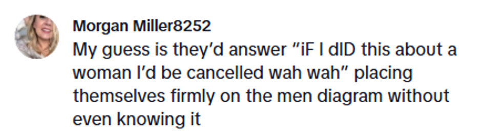 The second most common reaction was for the men to deflect and demand to know where the women's equivalent, a "Womenn Diagram," was and where she landed on it, refusing to answer the original question she asked.