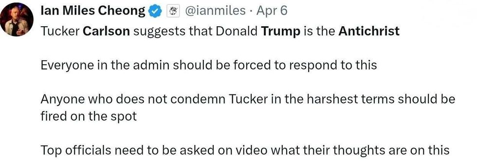 On Monday, Carlson started going in on Trump's infamous profane Easter Sunday Truth Social message, calling the POTUS "evil" and pointing out Trump refused to put his hand on the Bible during his second inauguration.