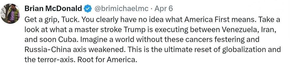 Carlson then read Trump's Truth Social post threatening to destroy a civilization. Whether Trump was referring to Iran or the United States was unclear.