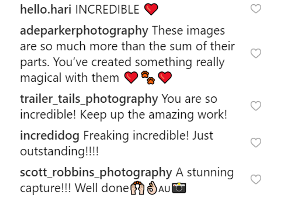 Jess specializes in capturing animals in motion - showcasing their athleticism. Her pictures are usually full of movement and action, and she's always looking for new ways to showcase what the animals are capable of.