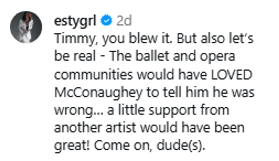 Soon after, various organizations and individuals began responding to Chalamet's dismissal of ballet and opera as valid art forms, including the Royal Ballet and Opera and Irish opera singer Seán Tester.