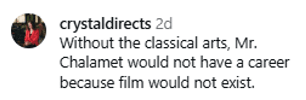 It's heartening to see people coming together to defend theater, opera, the ballet as valid art forms, in addition the movie theater domain that Chalamet prefers.