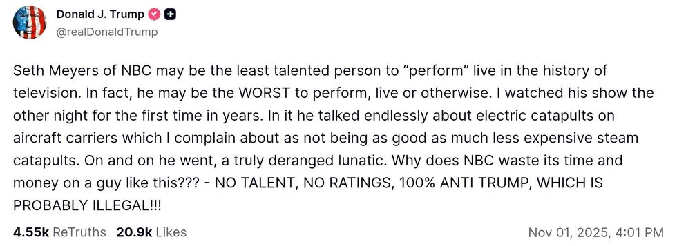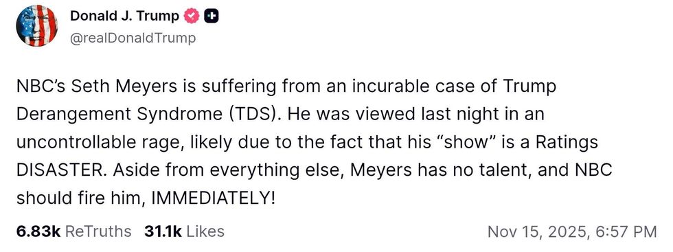 Trump has attacked Meyers before. He posted about the Saturday Night Live alum back in October of 2022 and again in January and August of 2025.