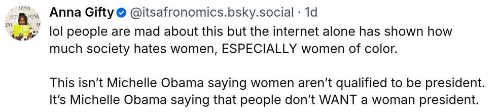 The recent examples of two stellar female candidates running and losing to an unqualified, uneducated, psychologically unbalanced criminal would seem to contradict this. Michelle is right imo.