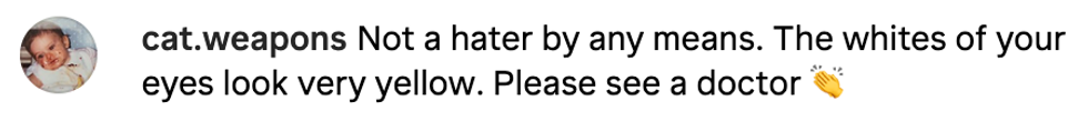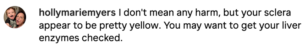 "I don't mean any harm, but your sclera appear to be pretty yellow. You may want to get your liver enzymes checked."