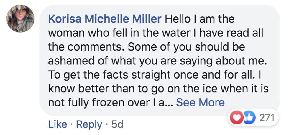 Some, however, focused more negatively on Miller's appearance, leaving comments on the Facebook video about her size and her clothing. Some referred to her weight as the primary reason why the ice gave way so quickly when she fell and why it was so difficult to pull her up to the dock.