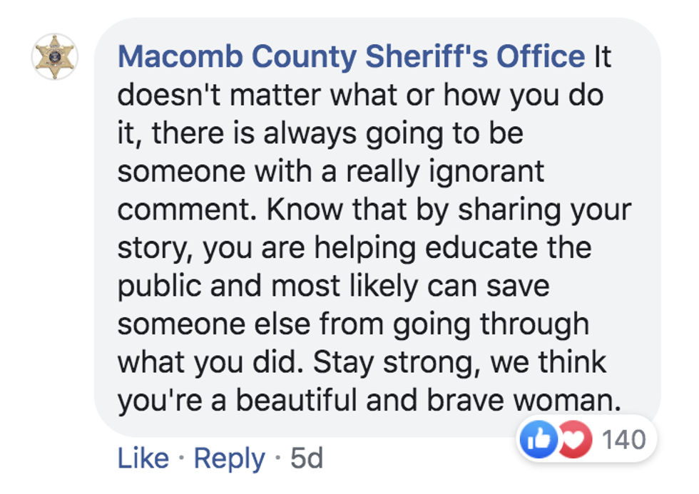 "Know that by sharing your story, you are helping educate the public and most likely can save someone else from going through what you did."