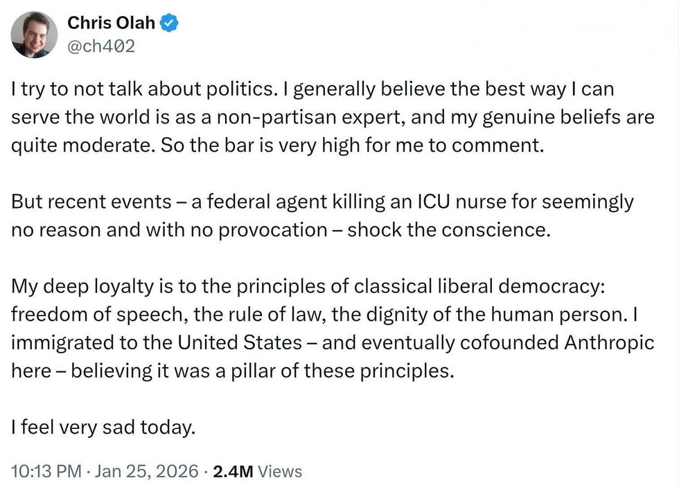 "My deep loyalty is to the principles of classical liberal democracy: freedom of speech, the rule of law, the dignity of the human person. I immigrated to the United States – and eventually cofounded Anthropic here – believing it was a pillar of these principles."