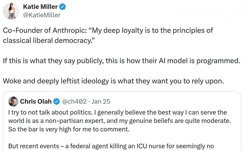 Thinking her marriage to the architect of American fascism and hosting a podcast so banal not even the MAGAsphere wants to watch gave her some insight into anything, Miller went after Anthropic co-founder Chris Olah on X. Anthropic is an artificial intelligence safety company.