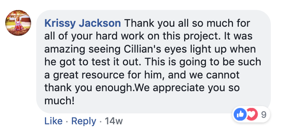 Krissy extended her gratitude on Facebook by commenting on the Rogue Robotics' page that posted the video of Cillian on the zoom.