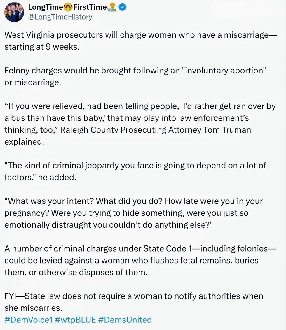 West Virginia prosecutors will charge women who have a miscarriage—starting at 9 weeks. Felony charges would be brought following an "involuntary abortion"—or miscarriage.