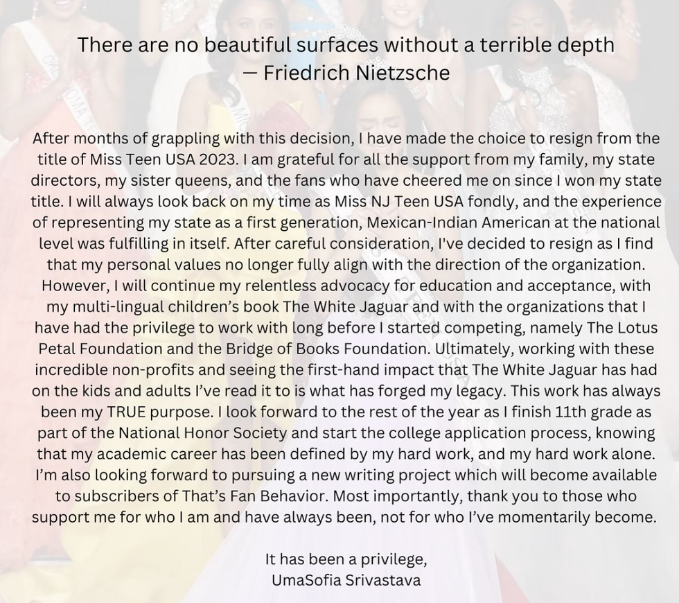 Then, just two days later, Srivastava announced she was stepping down, writing in her statement on Instagram: