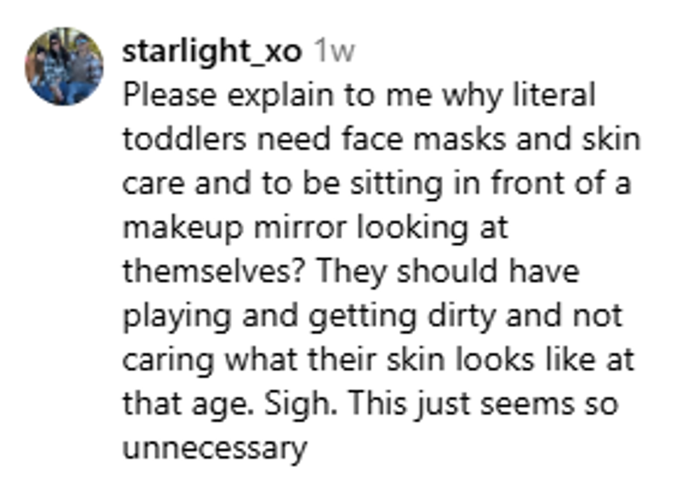 The day before the launch, she shared an image on Instagram of a very young girl stretching a faint pink skincare mask across her face, visibly sized to fit a child's face, rather than something she might have taken from her mom's self-care collection.