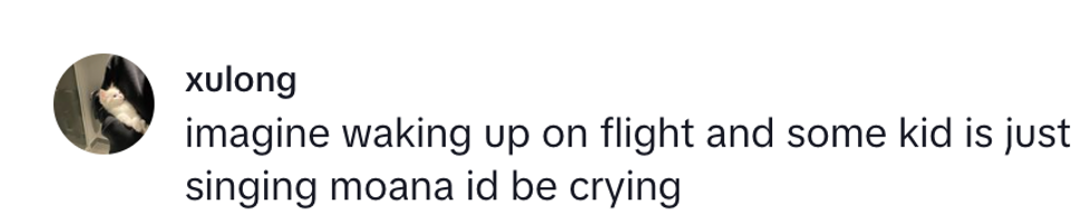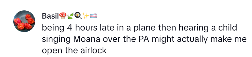 One TikToker who goes by the handle @chloreallychloreally posted a video of her and the passenger in the seat next to her listening to the young Disney cover artist with confused expressions on their faces, with a text overlay reading "our flight got delayed bruh what is thissss."