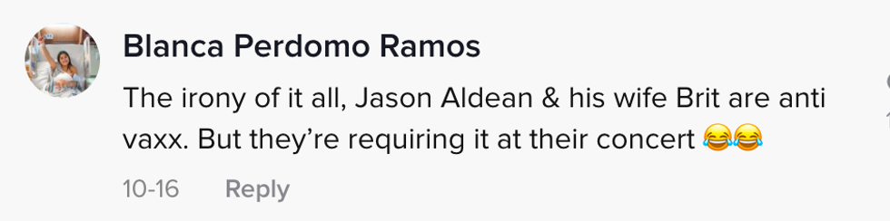 Soogia pointed out buying a ticket is a legal contract and in order to purchase the ticket for the venue where Jason Aldean was playing, this woman and her party would have needed to complete a health check and accept an agreement that stipulates that either a vaccine card or a negative test within the past 72 hours was required.