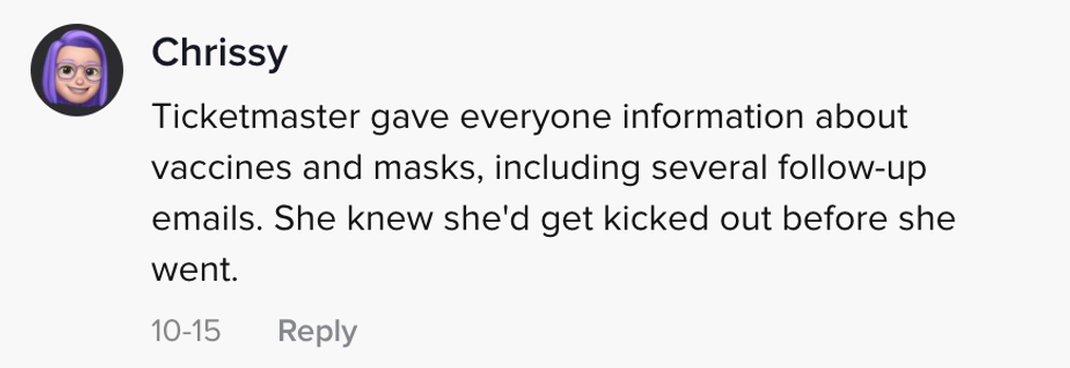 A woman declared she paid $150/ticket and over $500/suite for a country music concert. Her group was both unvaccinated and they refused COVID tests at the concert.