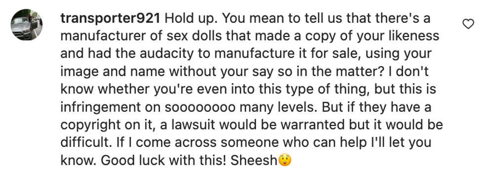 "They did it without my consent, they use it for commercial use, it's a sex doll—all these crazy things—but it does mean people find me attractive, so I guess I chose to see it as flattering."