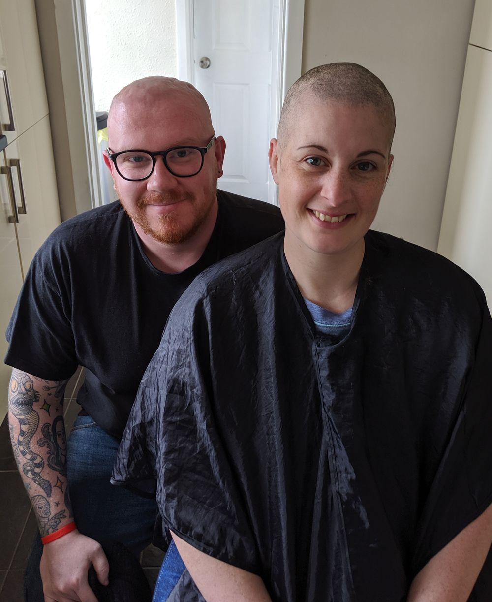 Within two weeks, Breen's hair began to fall out, so she decided to shave it off in September. Her husband joined her in solidarity.