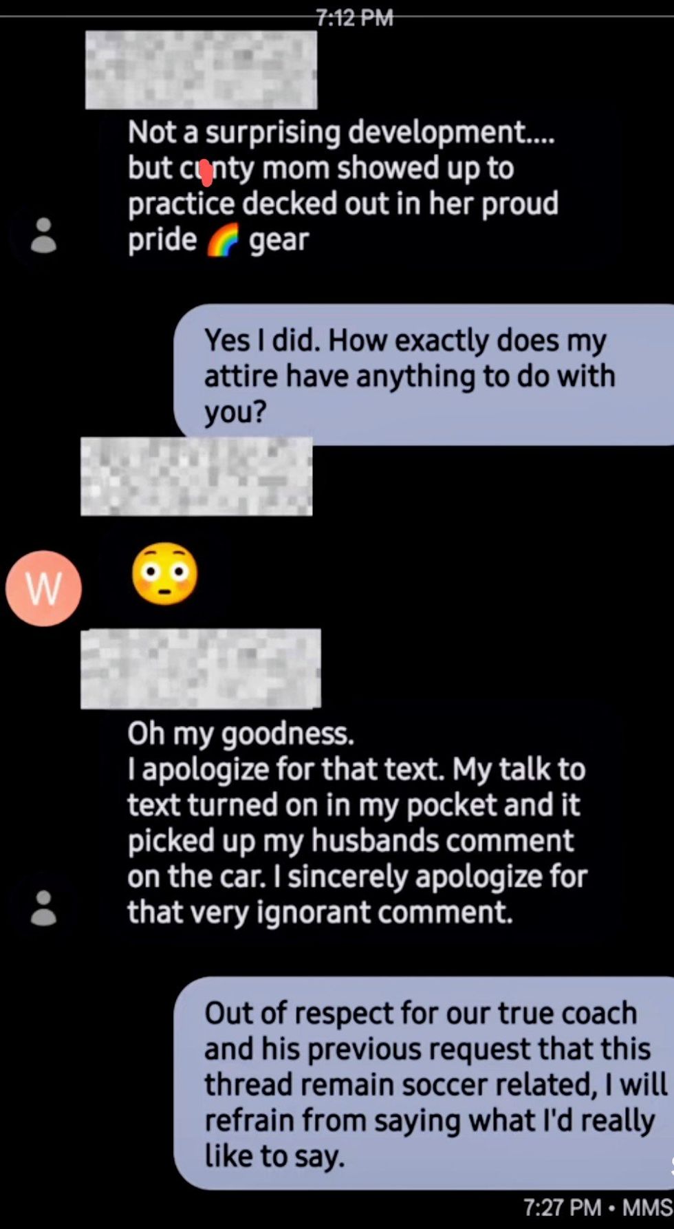While the rude comments don't exactly surprise anyone because there are still too many entitled, emboldened anti-LGBTQ+ people in this country, it still is somewhat shocking she—or her husband—made their comment in such a public setting as a children's soccer team group chat.