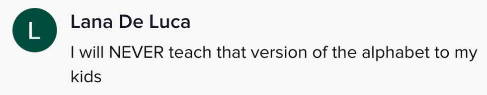 "I have a fifth grader, a fifth grader, a fourth grader, a third grader, a third grader, a first grader, and a preschooler and I just got news that the alphabet song is changing."