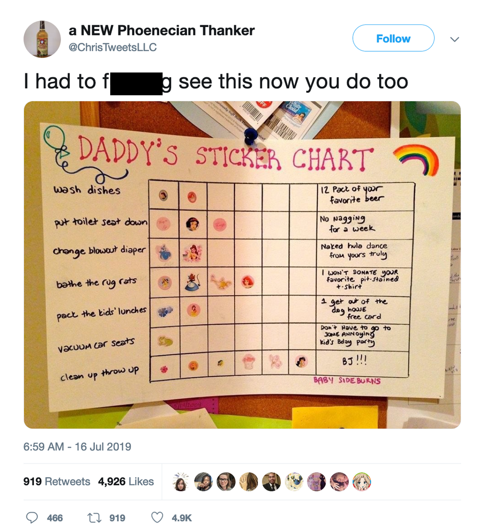 A picture of a chart surfaced online where a mother is rewarding daddy with stickers to assist with parenting chores. And the internet is dry-heaving a little.