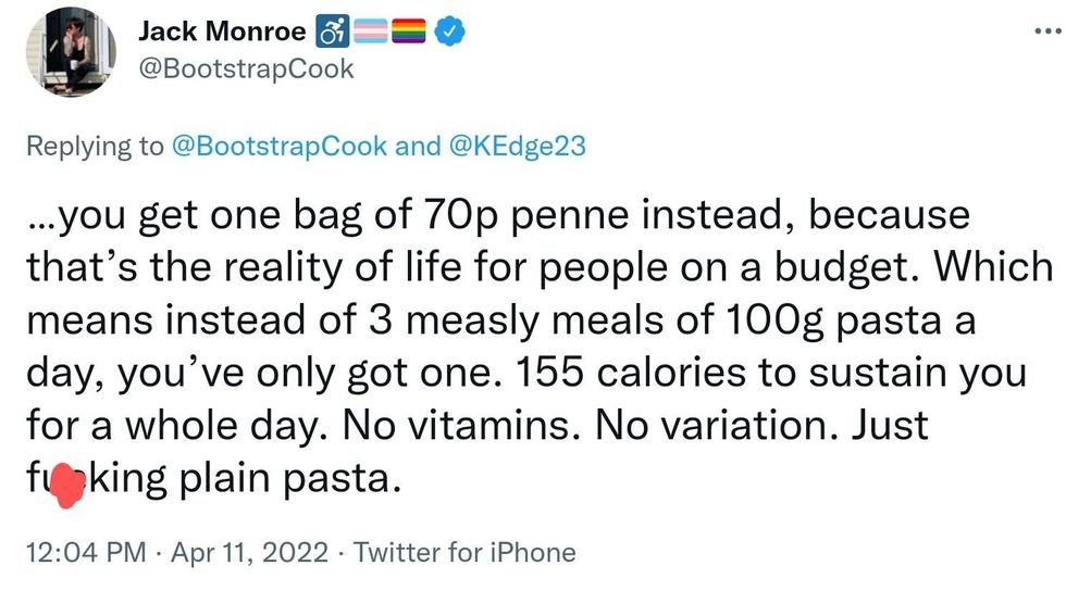 helping people like Rebecca day after day, while people like you sit in your comfy lives telling us all how you\u2019d be so much better at being poor than we are. SO DO IT THEN. Show us all how it\u2019s done and I look FORWARD to your bestselling cookbook on the subject. Best of luck!— Jack Monroe \u267f\ufe0f\ud83c\udff3\ufe0f\u200d\u26a7\ufe0f\ud83c\udff3\ufe0f\u200d\ud83c\udf08 (@Jack Monroe \u267f\ufe0f\ud83c\udff3\ufe0f\u200d\u26a7\ufe0f\ud83c\udff3\ufe0f\u200d\ud83c\udf08) 1649693400