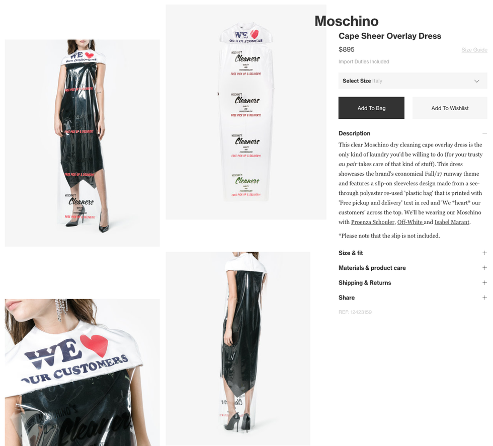 "This clear Moschino dry cleaning cape overlay dress is the only kind of laundry you'd be willing to do (for your trusty au pair takes care of that kind of stuff). This dress showcases the brand's economical Fall/17 runway theme and features a slip-on sleeveless design made from a see-through polyester re-used 'plastic bag' that is printed with 'Free pickup and delivery' text in red and 'We *heart* our customers' across the top."