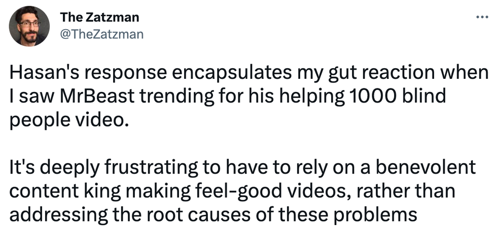 \u201cmy take on the mr beast stuff is it was way too easy for one (1) rich guy to provide life-altering healthcare to a huge number of ppl & that itself is a gross thing, & i hate flashy, glorified acts of charity bc they aren\u2019t a solution at all, but also he isn\u2019t literally satan\u201d— daniella (@daniella) 1675095146