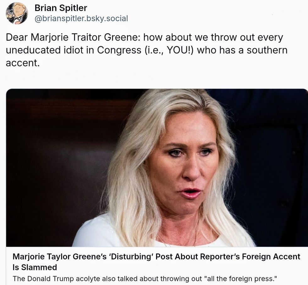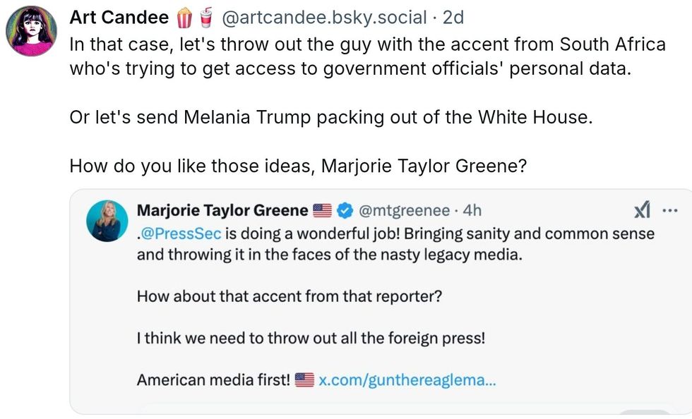 On Friday afternoon, Georgia Republican Representative Marjorie Taylor Greene took to Elon Musk's X social media platform to praise Donald Trump's current White House Press Secretary—and spread xenophobia.