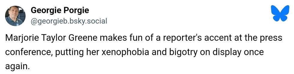 In addition to giving the current White House mouthpiece Karoline Leavitt kudos, Greene took exception to a Foreign Press Association member's accent.