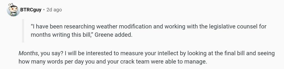 Greene's post followed the deadly floods in Texas, which the MAGA Rep. surely blames on weather manipulation by Democrats.
