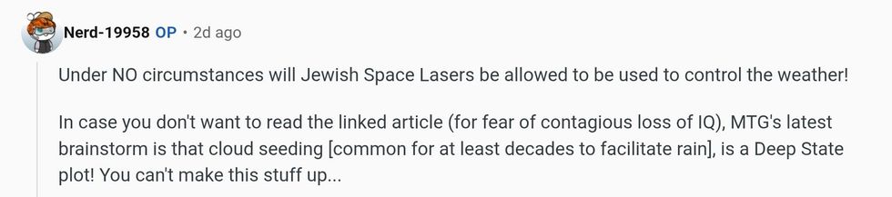 Greene didn't specify if her weather modification research was done with the same people that taught her about the Jewish space lasers that cause wildfires or if it was the people that taught her the mass murder at Marjory Stoneman Douglas High School in Parkland, Florida, was a false flag operation designed to take away her guns.
