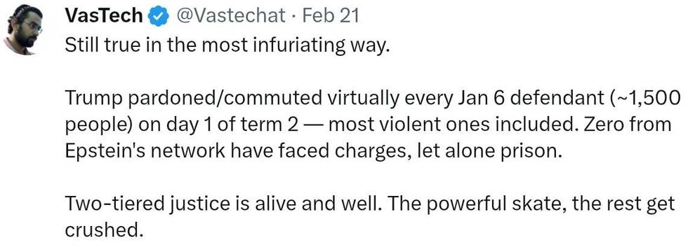 The 43-second clip, from an over one hour interview, featured the pair laughing about the disparity between the prosecution of the violent insurrectionists who stormed the United States Capitol on January 6, 2021, versus Jeffrey Epstein's friends and clients who trafficked and sexually exploited young women and children.