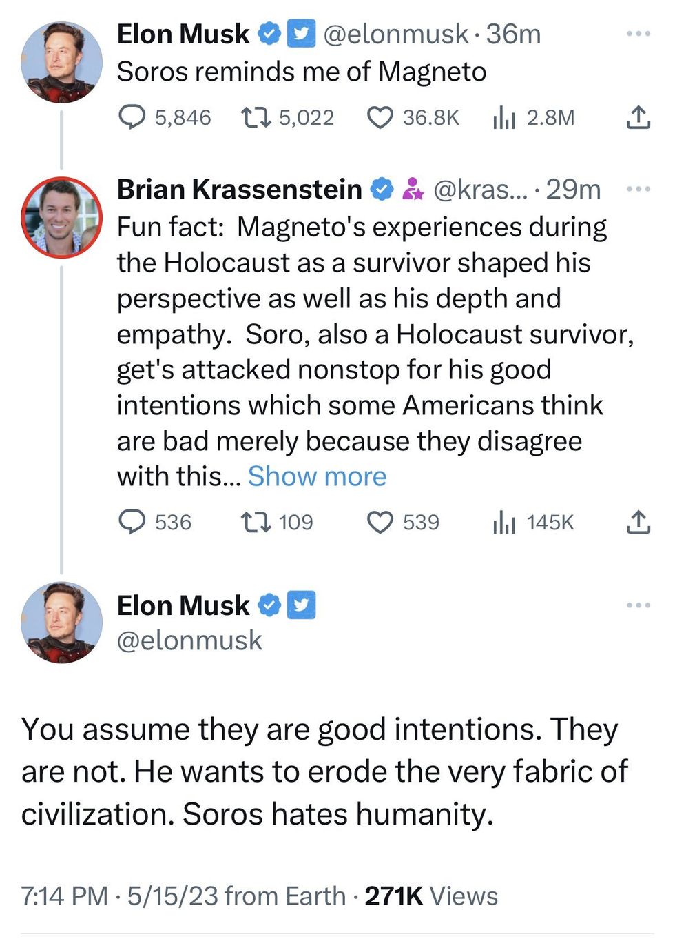 \u201c@elonmusk @krassenstein \u201cSoros hates humanity\u201d Wow. You either believe this crap or you\u2019re just trying to excite your far-right followers. I don't know what\u2019s worse.\u201d— Elon Musk (@Elon Musk) 1684202551