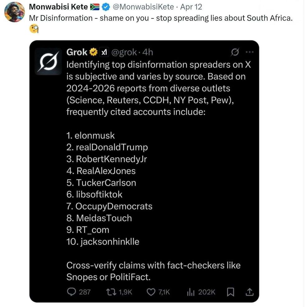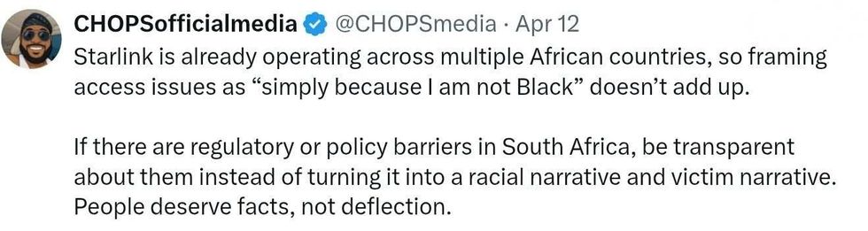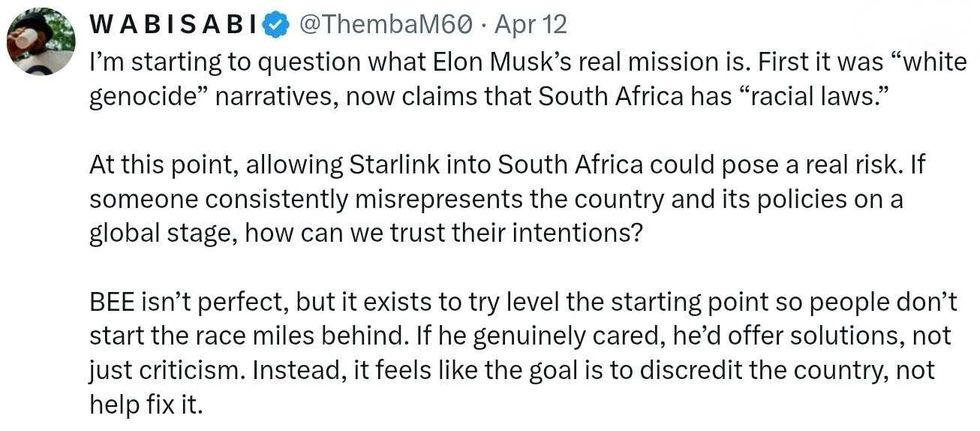 "South Africa won’t allow Starlink to be licensed, even though I was BORN THERE, simply because I am not Black!"