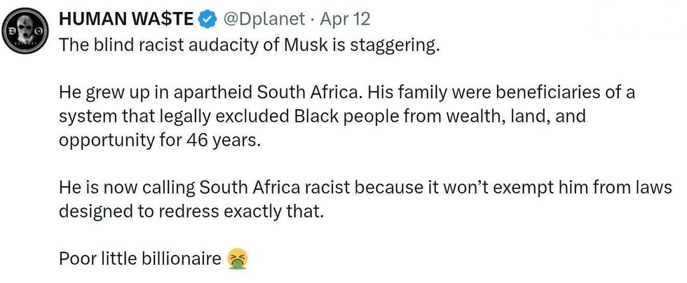 Musk whines about anti-White racism a lot in a country where 46 of 47 Presidents were White men and it took over 200 years for an Indigenous woman to be a member of Congress.