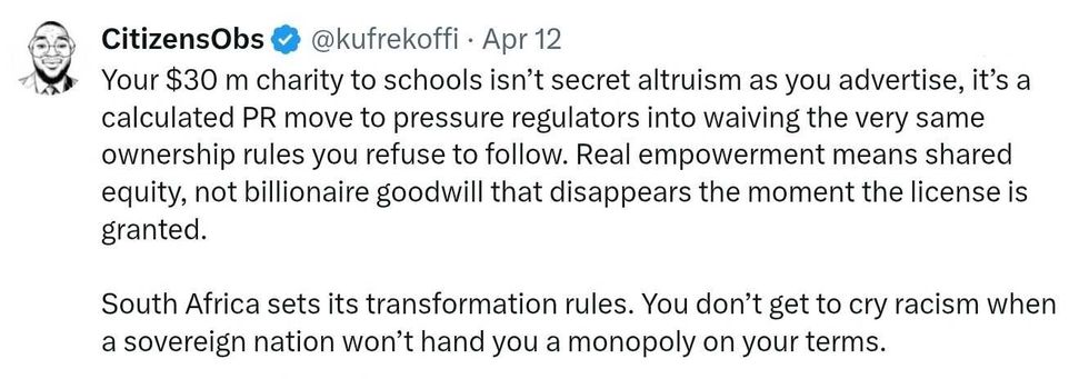 "[Elon Musk] watching the more than 600 USA companies investing more in [South Africa], complying with [South African] laws & thriving. Zero drama!!"