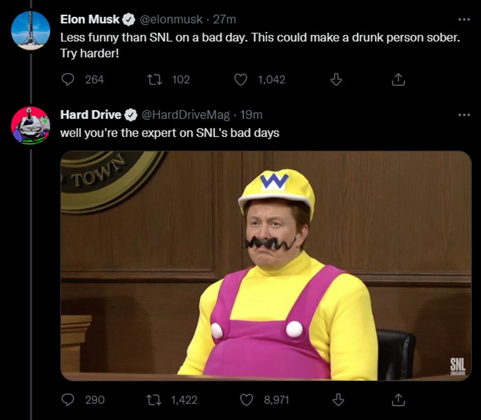 The tweet was accompanied by a photo of Musk dressed as Wario during his guest appearance on SNL. It was after this post Musk deleted the chain, but users got a hold of the exchange before it disappeared for good.