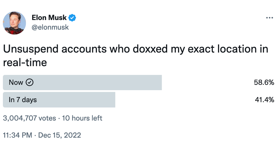 \u201cUnsuspend accounts who doxxed my exact location in real-time\u201d— Elon Musk (@Elon Musk) 1671165265